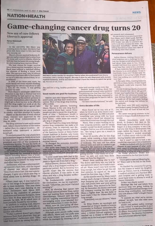 I started Gleevec in August 1998. At the time, it was not popular or well-known. No one was talking about it. But eventually as it showed more and more promise, people caught on. And people who started the drug many months after me were given credit for being the longest living survivors on Gleevec. I had been saying through the years that I was the longest living, but was ignored and dismissed. Other patients were featured in best-selling books and spoke on national and international panels about it. I was written out of history and became a hidden figure.
